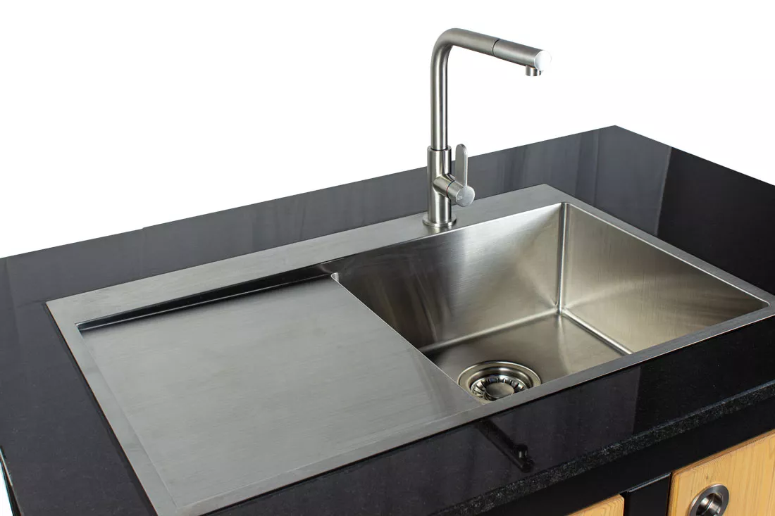 Zu jeder gut ausgestatteten Outdoor Küche gehört ein Spülbecken, zum Händewaschen, Gemüse waschen oder einfach zum abspülen. Das Outdoor Modul Toni ist mit einem Spülbecken aus gebürstetem Edelstahl ausgesattet und hat eine satinierte Oberfläche. Die Armatur ist ein Einhebel-Mischbatterie mit Hochdruck-Armatur, ebenfalls aus gebürstetem Edelstahl.