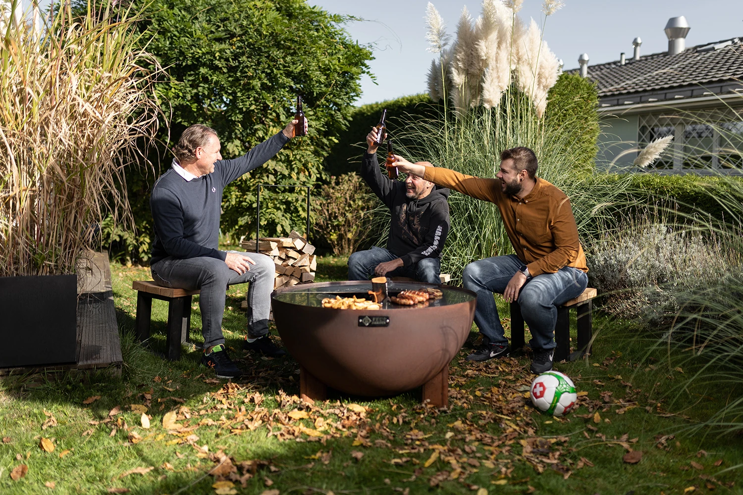 Auch optisch gibt die Feuerschale TRIA einiges her. Die kompakten Standfüße sorgen für eine angenehme Arbeitshöhe, wodurch ein gemütliches Beisammensitzen beim gleichzeitigen Grillen ermöglicht wird. Das Design ist in schwarz und in Rostoptik erhältlich.