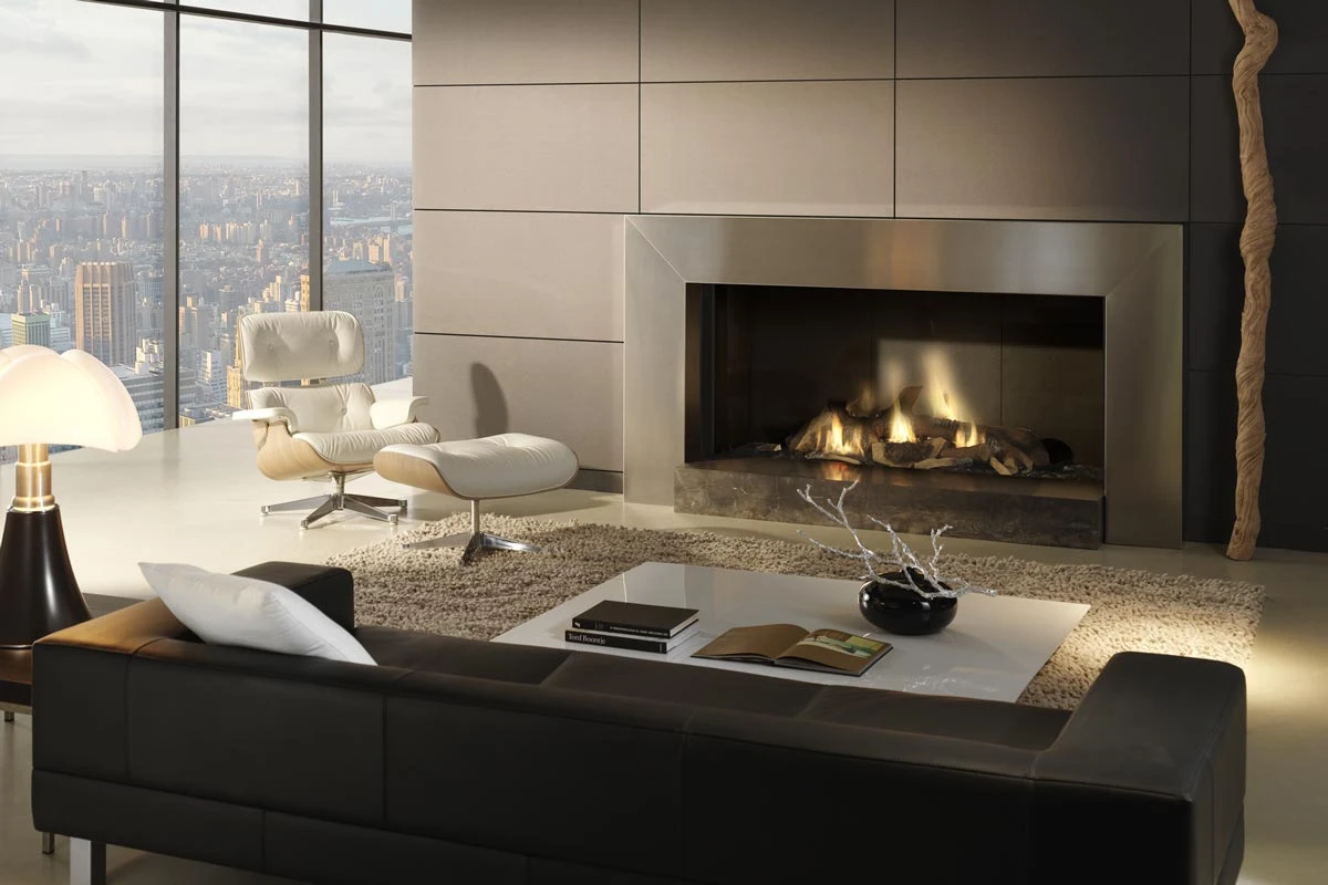 Die Innenauskleidung hinter dem Feuer ist in Schwarz, glatt edel gestaltet, während die standardmäßig im Lieferumfang enthaltenen braunen Holzscheit-Imitate dem Beobachter einen täuschend echten Holzkamin-Eindruck vorspiegeln.