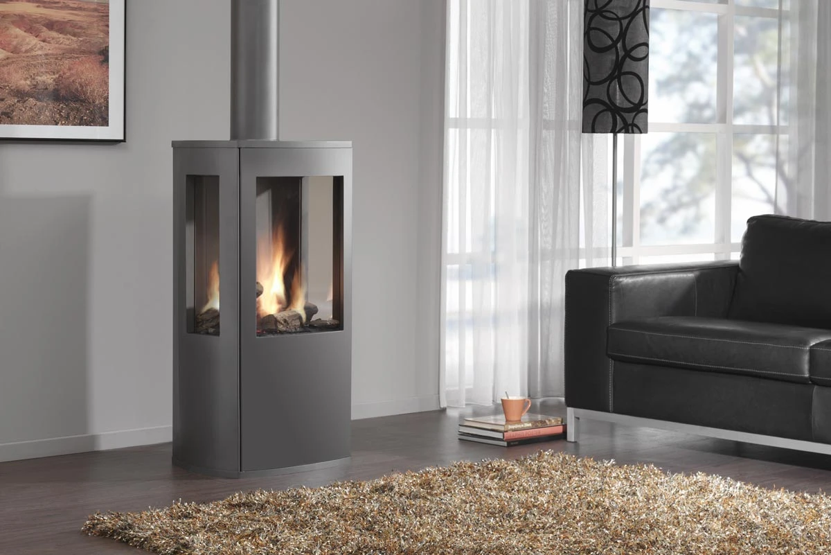 Der Gaskaminofen Dru Trio verbindet die klassische Optik eines Holzofens mit Abzug nach oben mit der bequemen Gasfeuerung, durch die das Herantragen von Holz und die umfangreiche Reinigung der Feuerstelle nach jedem Gebrauch entfällt. Betrieben wird er mit Erdgas G20, G25 oder G31.