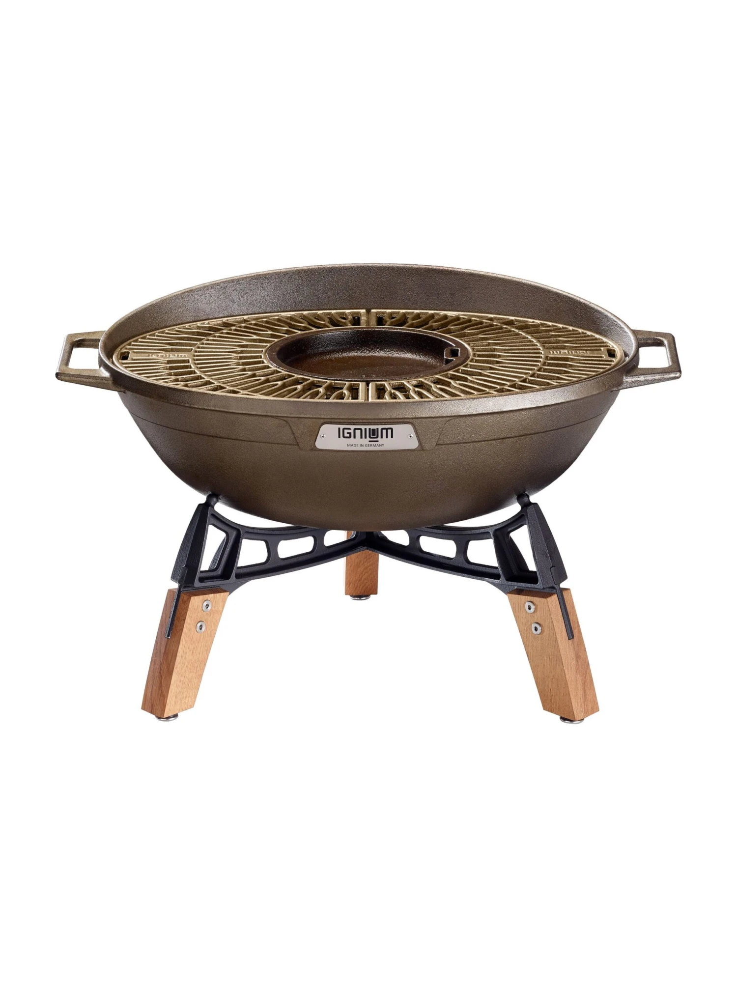 Die Verwendung von hochwertigem, recyceltem Gusseisen als Material für die Feuerschale ist ein weiterer Vorteil, da es eine ausgezeichnete Wärmeleitung und -speicherung ermöglicht. Des Weiteren sind die Füße aus regionalem Eichenholz gefertigt.