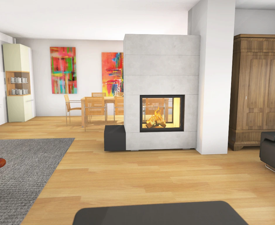 Selbstverständlich kann die natürliche Wärmebetonhülle aber auch anderweitig verkleidet werden. Eine edle Oberfläche schaffen Sie sich beispielsweise über angebaute Großkeramikteile. Dekorativ kann die Fassade auch mit Farbe oder Putz dem Raum angepasst werden. Zu beachten ist hier lediglich, dass ein hitzebeständiger Anstrich gewählt werden muss.