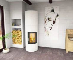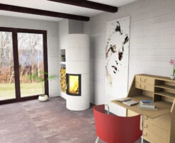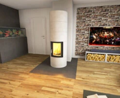 Mit einem Durchmesser von 65 cm wirkt die Säule ruhig, aber dennoch kraftvoll. Die Oberfläche des Ofens kann nach Belieben verputzt, mit Keramik gestaltet oder in der modernen „Sichtbeton-Optik“ belassen werden. Bereits 24 Stunden nach der Montage kann die Verkleidung mit farblichen Akzenten versehen werden.