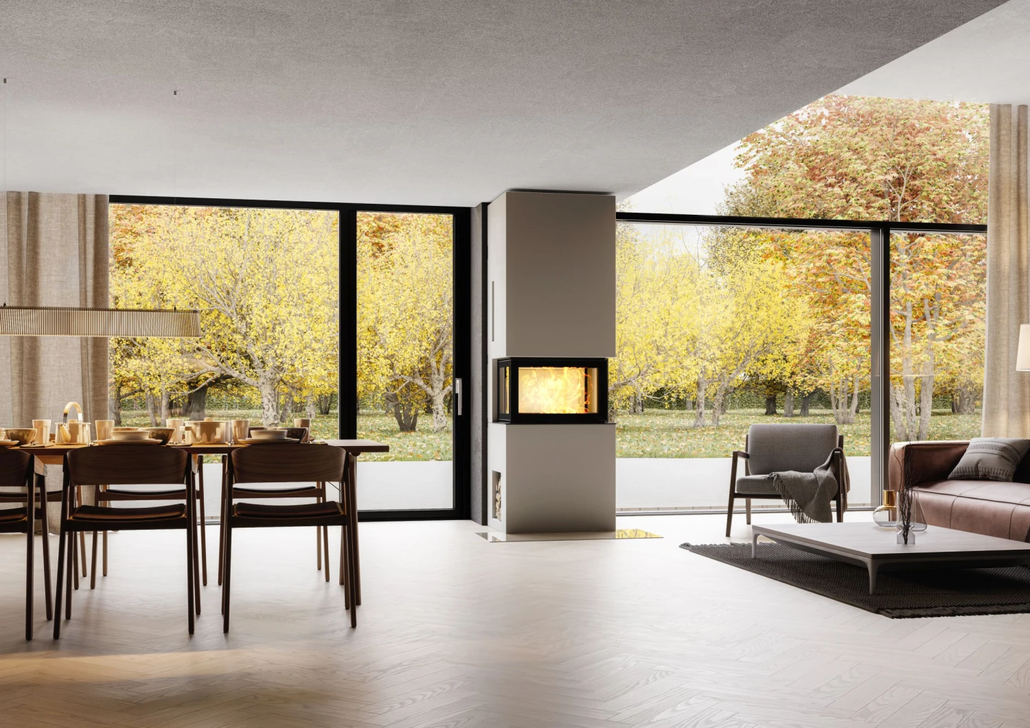 Die Kaminanlage Geneve eignet sich ideal für großflächige Räumlichkeiten und verfügt über eine raumhohe Konstruktion. Durch die Verwendung von Erweiterungsmodulen kann die Höhe des Kamins an die Raumgröße angepasst werden. Mit einer dreiseitigen Sicht auf die Flammen ist ein beeindruckendes Feuererlebnis garantiert. Die stilvolle Holznische des Kamins bietet ausreichend Platz für die Lagerung von Brennholz, ohne dabei das Interieur des Raums zu beeinträchtigen. Dank der integrierten Brandschutzwand kann der Kamin direkt an einer brennbaren Wand platziert werden, ohne Sicherheitsbedenken zu verursachen.